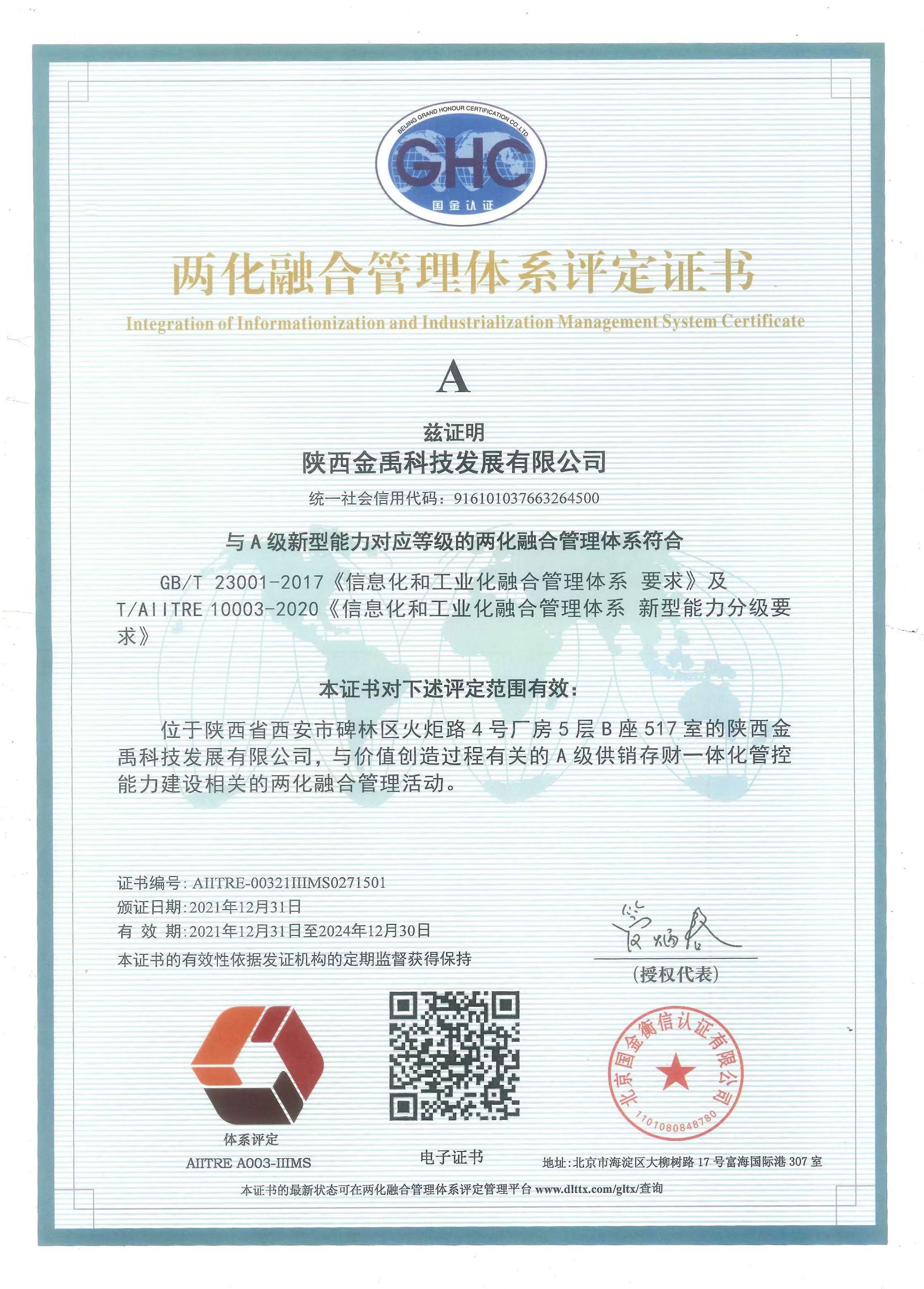 熱烈祝賀我司順利通過工信部《信息化和工業(yè)化融合管理體系要求》(GB/T 23001-2017)體系認(rèn)證,獲得兩化融合管理體系評定證書!